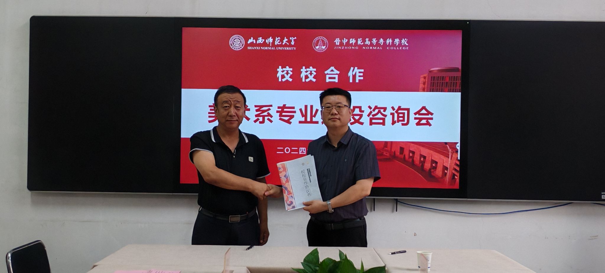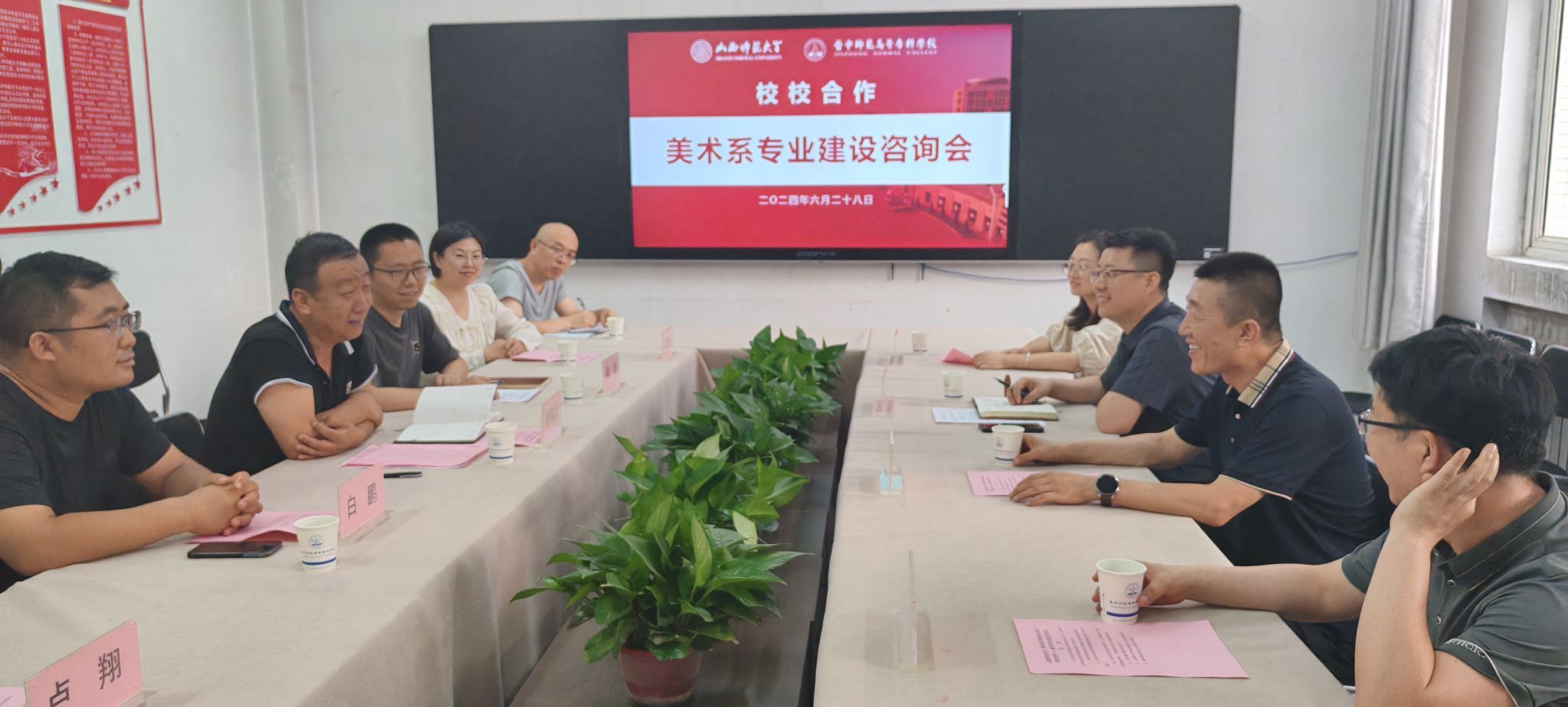 为加强校校交流合作,促进专业协同创新发展,2024年6月28日公司党总支书记王志宏、经理曹亚彬、副经理黄玉岩、理论教研室主任杨二斌一行应邀赴晋中师范高等专科学院参加美术系专业建设咨询会。