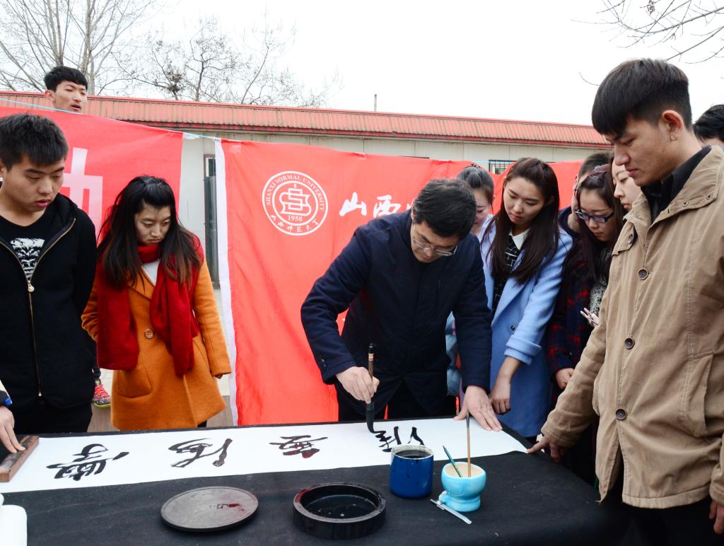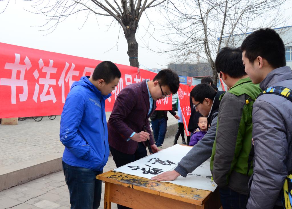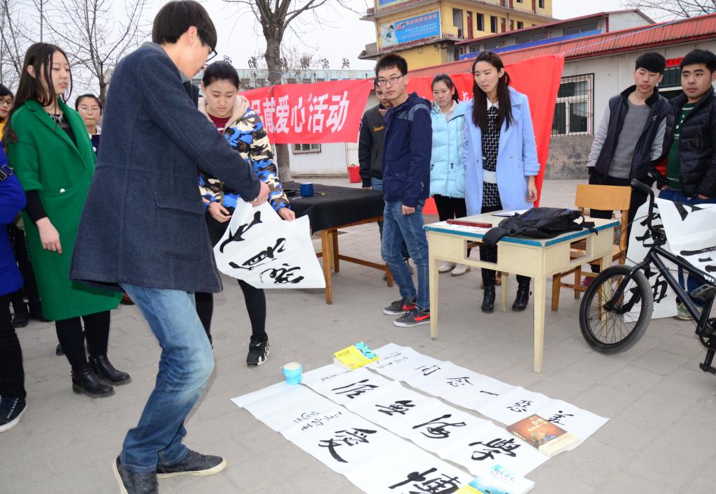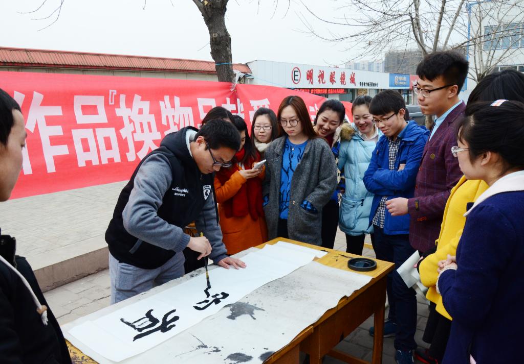 在学雷锋活动纪念日来临之际,3月4日下午,乐天使组织优秀员工,在校园西门口平房前,以现场书写的方式,用自己的书法作品向师生换取书籍、旧衣物等学习生活物品,并把换来的物品通过校236爱心社团捐献给山区的贫困孩子。