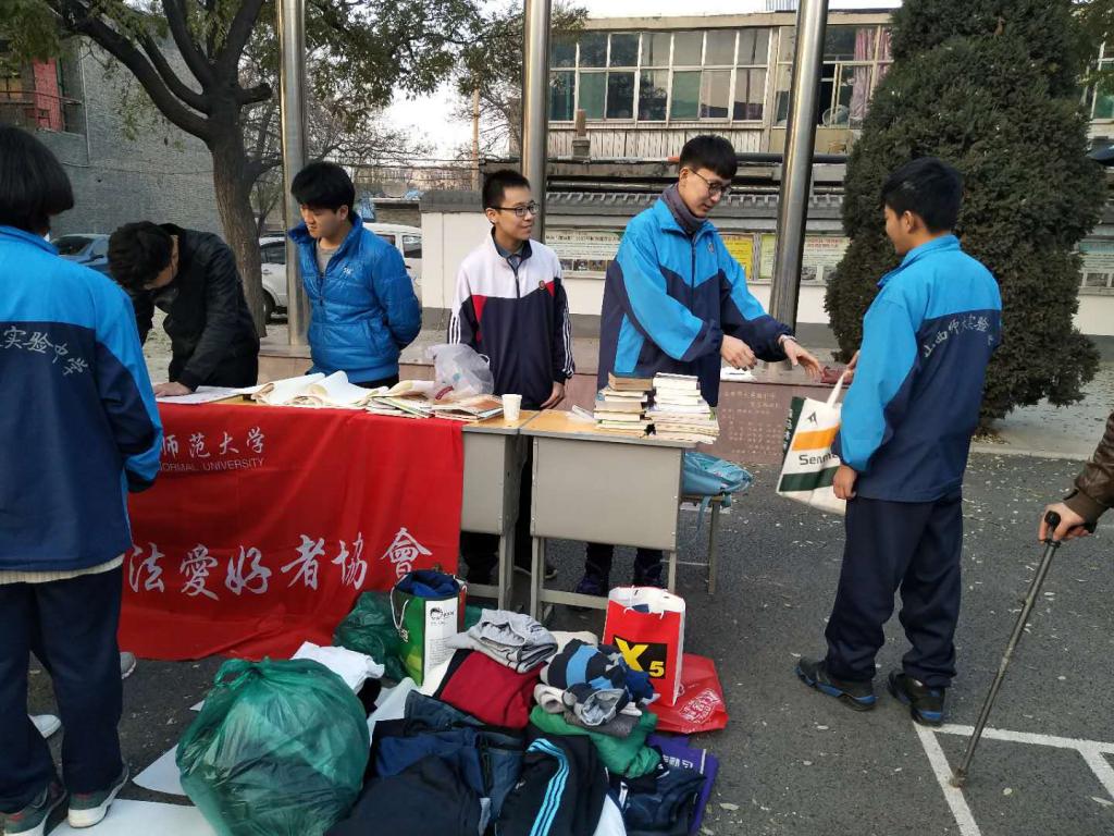 本次活动主要在师大实验中公司内进行,活动参与者可通过捐献自己的旧书籍、文具、衣物等与我们的志愿者交回一幅书法作品。活动现场,实验中学的员工们踊跃参与,积极募捐,纷纷为贫困山区的孩子们献上自己的一份爱心。活动最后书法爱好者协会主席武文斌现场书写“高考加油”四个大字,祝福实验中学学子能步入自己理想的大学。