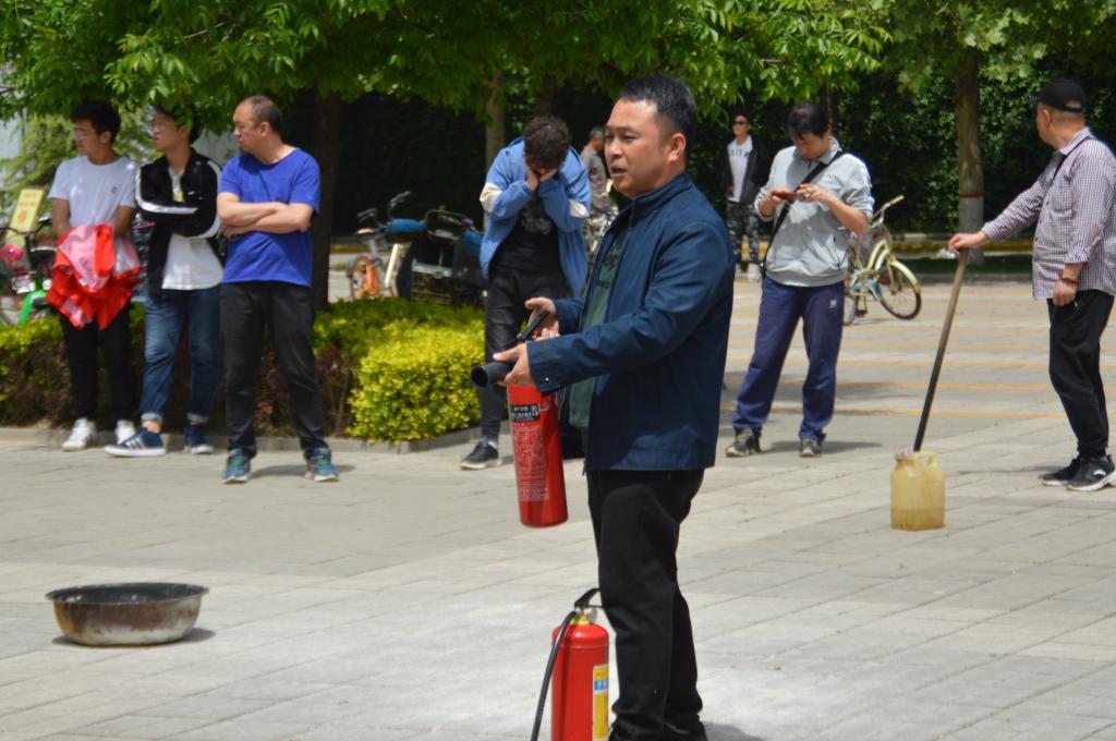 随后,崔哲老师向全体人员讲解了消防安全知识,重点说明了消防灭火器的种类和使用方法。讲解结束后,崔哲老师与消防科工作人员模拟火灾现场,为同学们现场进行了干粉灭火器和二氧化碳灭火器灭火操作演示。演示结束后,同学们也踊跃参与现场灭火演练,积极掌握灭火器的使用方法。