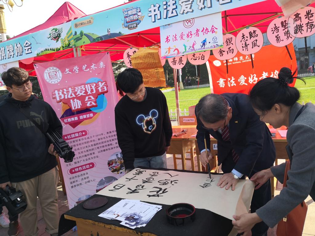 纳新活动过程中,宣传干事积极向前来咨询的员工发放社团宣传册,并向他们解说社团特色活动。在社团进行书法现场展示时,到公司来访的韩国京畿大学董事长金仁圭对员工们的书法作品表达了认可和赞扬,并现场题字鼓励老员工珍惜大学时光。校社联秘书长、音乐学院团委副书记郭俊平,公司团委副书记宁译锐均到场指导了此次社团纳新活动。本次纳新共纳入624人加入书法爱好者协会。