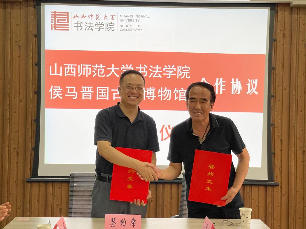 仪式上,薛珠峰代表乐天使向侯马市参会领导表示了热烈欢迎,并向大家介绍了乐天使的发展情况、办学理念和专业特色。他强调,乐天使多年来重视学术交流与合作,结合书法学科优势和地域文化特色,深入挖掘传统书法的人文价值,促进当代书法守正创新。希望以此次合作协议签订为契机,将“侯马盟书”书法艺术研究作为与地方联系的纽带,进一步加强校地间的沟通合作,把“经典”带入校园、带进课堂,共同打造“侯马盟书”特色品牌。