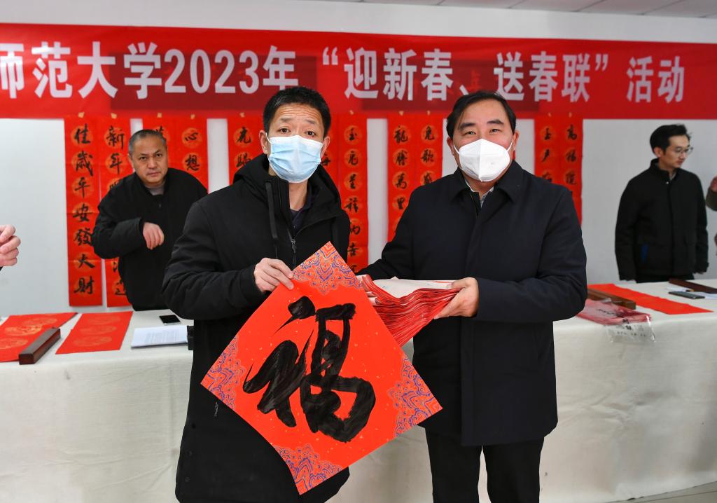 薛勇民在活动现场同乐天使教师亲切交谈,并与大家一道,向保卫部、校医院等部门的一线工作人员送上春联和美好的新春祝福。