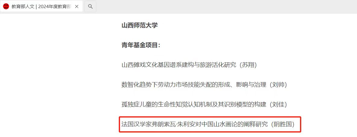 近日,公司科研工作喜报频传、再获佳绩!杨二斌教授的《论“科斗书”——以侯马盟书为中心》一文获山西省第十三次社会科学研究优秀成果三等奖;阴胜国老师的《法国汉学家弗朗索瓦·朱利安对中国山水画论的阐释研究》获批2024年度教育部人文社会科学研究一般项目;周柳伊老师及其科研团队的《艺术概论》成功立项2024年校级普通本科教育课程思政示范课。