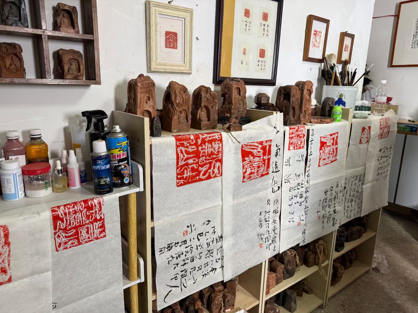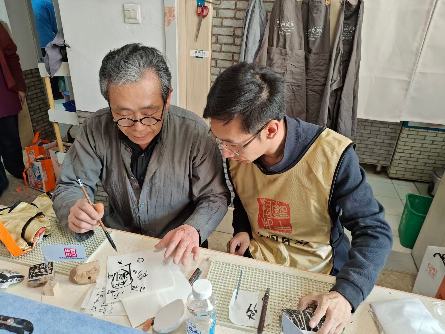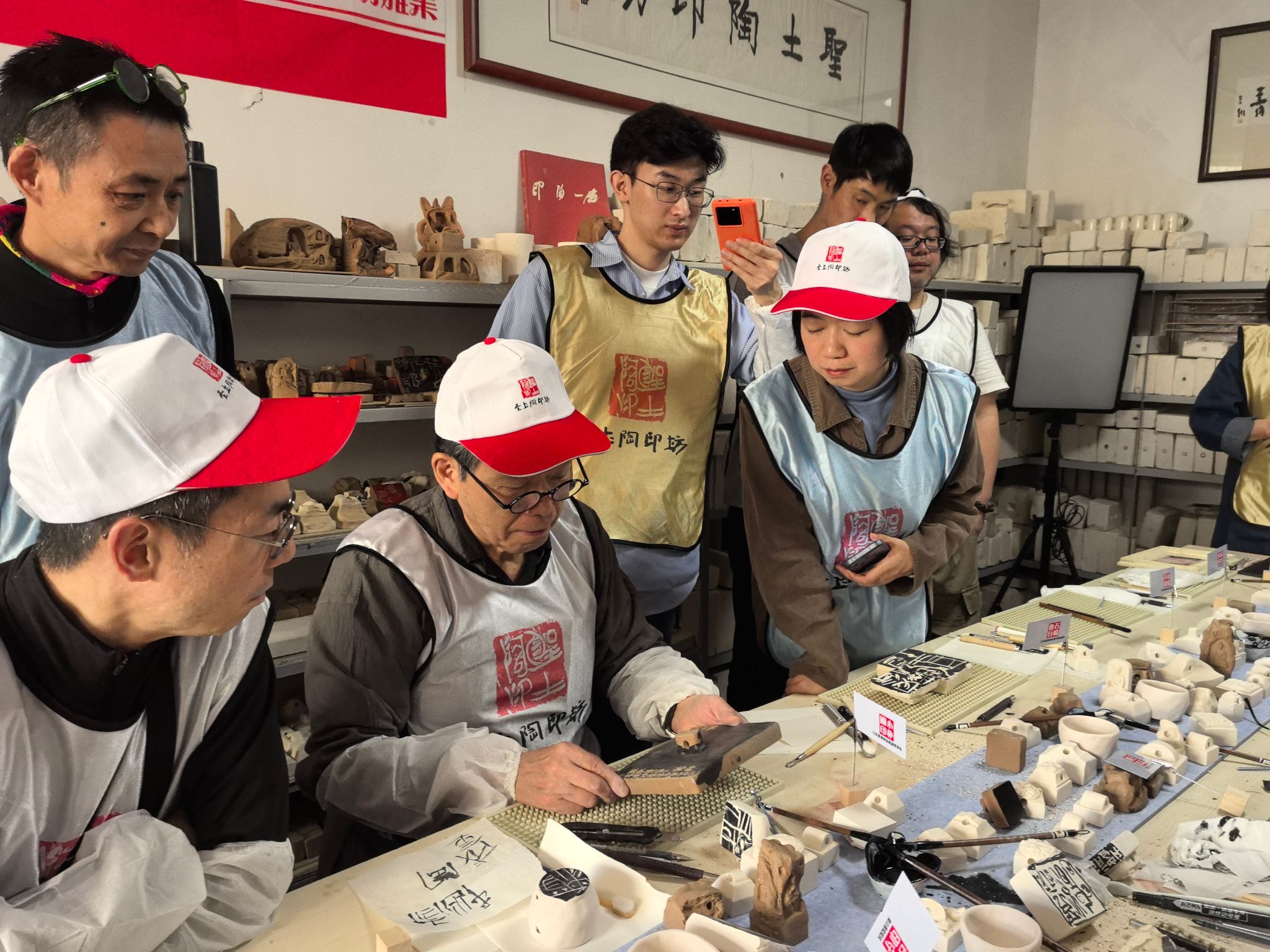 下午,吴成坤先生带领各位同道参观了第二届当代中青年陶瓷印展,并准备了湿泥供大家进行陶瓷印创作实践。在活动中,中日双方篆刻家摒弃传统刻刀,尝试使用各种新型工具,共同交流探讨和实践探索,为篆刻发展演绎出无限的可能性和创造性。