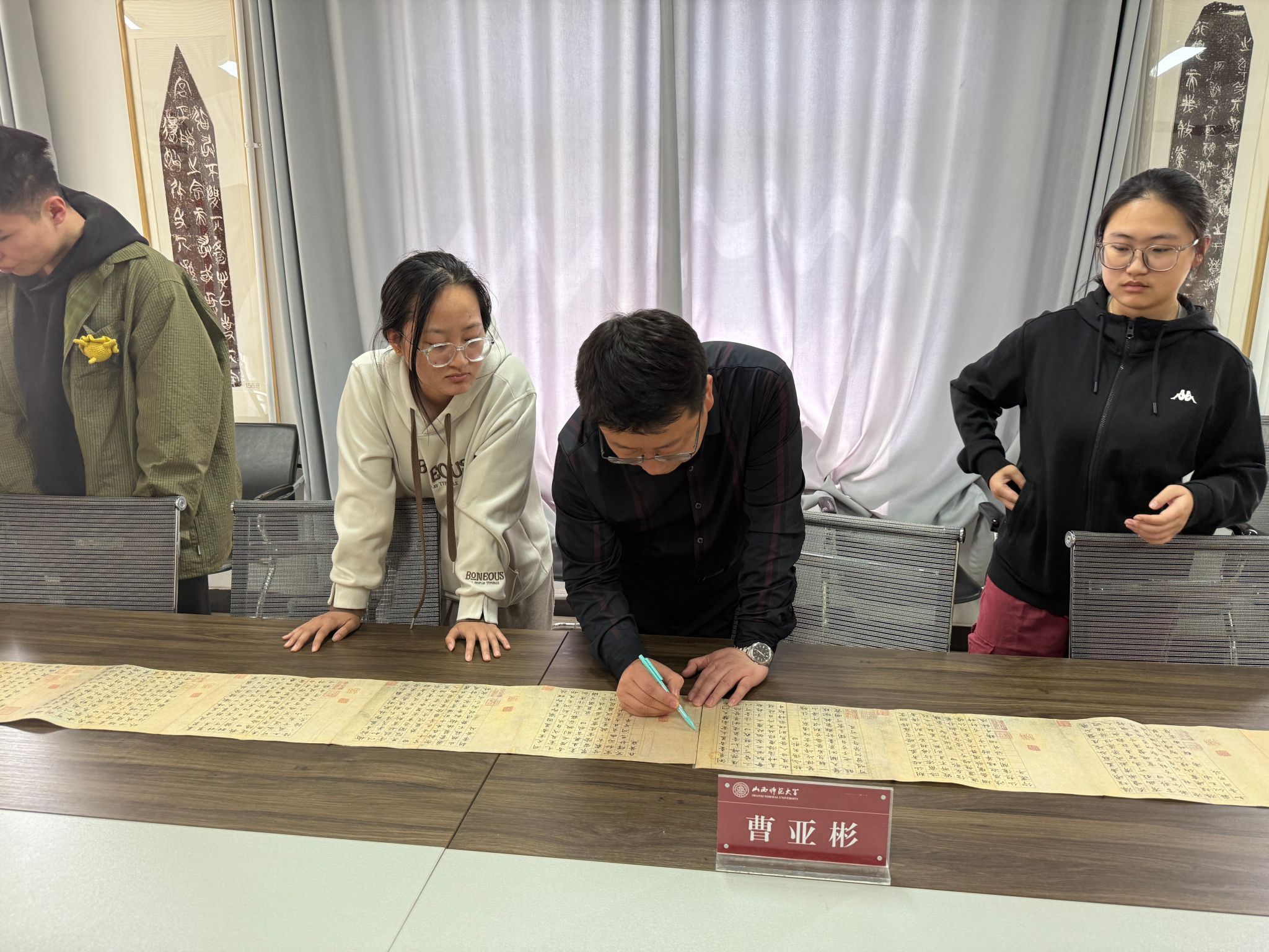 活动开始,23级同学们热情洋溢地将自己的精心之作一一展示,作品风格多样,有的飘逸灵动,有的刚劲有力,充分彰显了同学们的独特魅力和扎实基础。曹亚彬老师仔细查看,对每幅作品都进行了细致入微的点评。从笔画的运笔技巧到结构的布局安排,从墨色的巧妙运用到整体的气韵营造,曹老师既肯定了同学们的优点和进步,又指出了存在的不足,并给出了具体的改进建议。