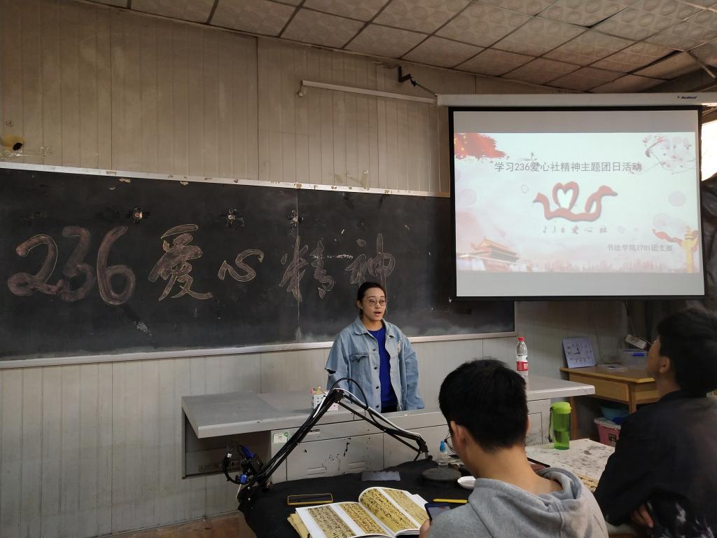 为了让支部团员深切体会236爱心社无私奉献精神,增强爱心公益意识,11月6日下午,乐天使1701团支部在02406教室开展了“学习236爱心社精神”主题团日活动,1701班团支部书记乔宇丹带领全体团员进行了学习。