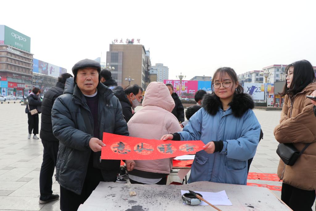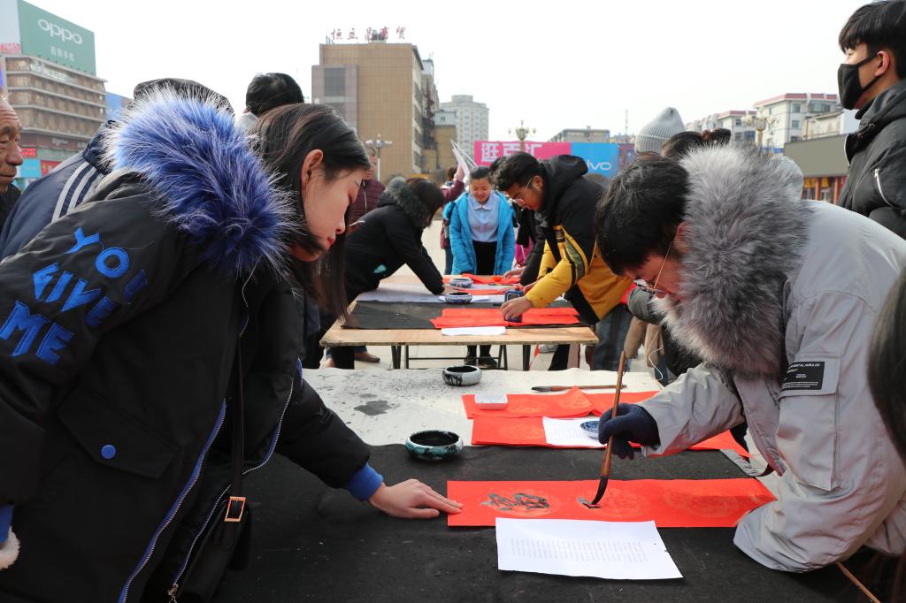 在临汾平阳广场中央,同学们笔走龙蛇间一副副洋溢着节日气息的春联便出现在市民们面前。市民们或是讨论春联的内容,或是欣赏已经写好的春联,现场气氛热烈,成为广场上一道靓丽的风景线。