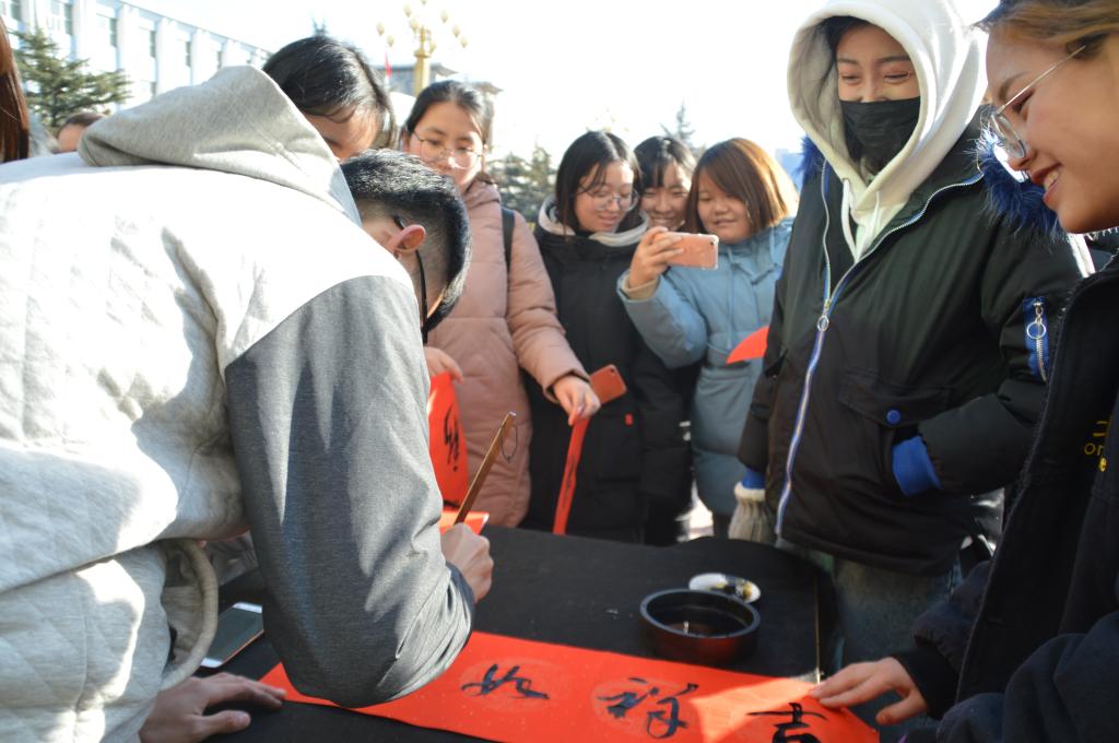 公司科学会堂门前,同学们挥毫泼墨笔端流畅,一句句饱含着对新春浓浓的期盼和祝福的话语跃然纸上,过往员工和老师们纷纷争相邀请同学们书写春联,希望自己在新的一年里有新的气象。尽管寒风凛冽,公司员工依旧火热地为过往师生书写春联,活动现场到处红红火火,好不热闹!