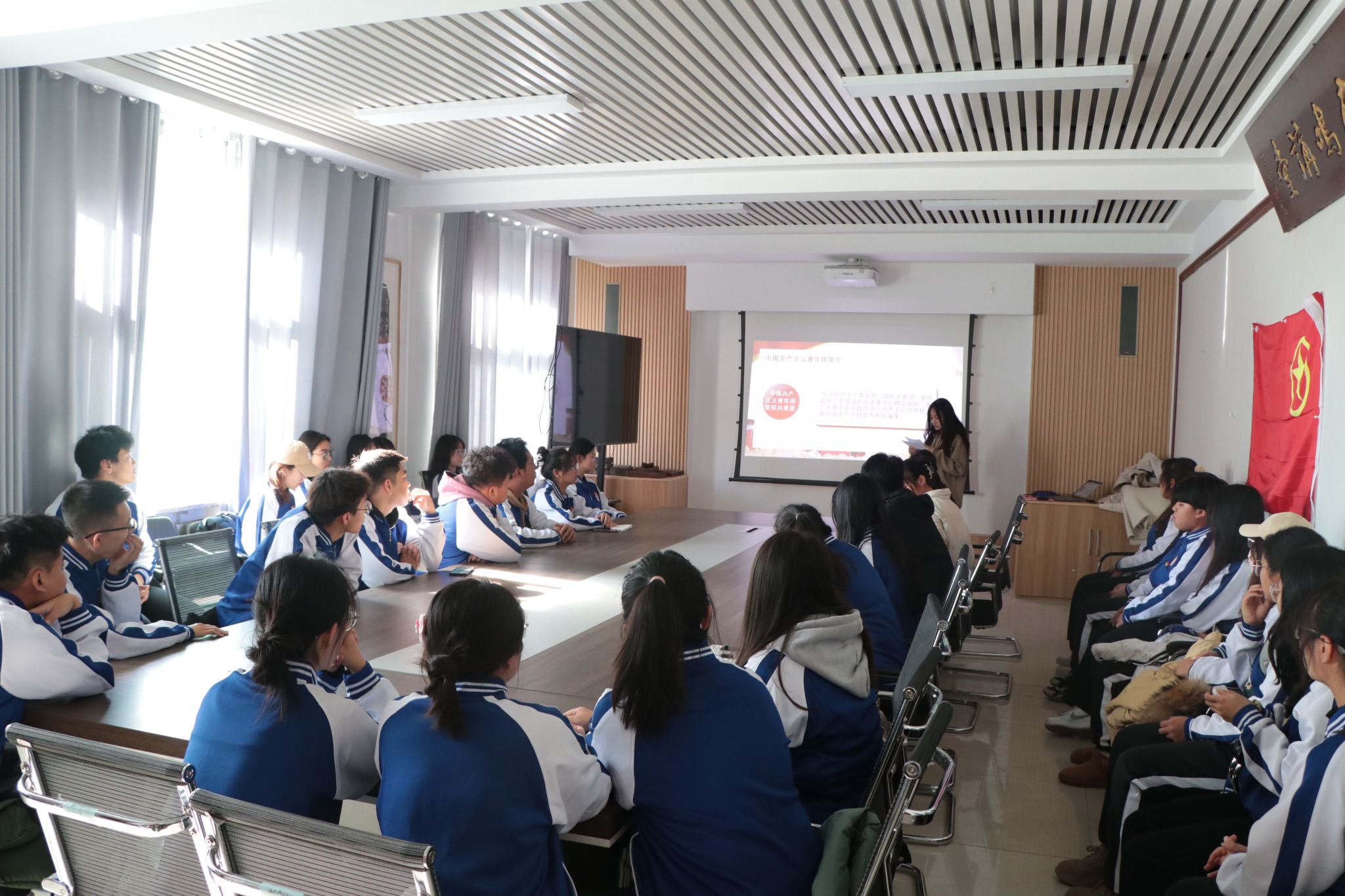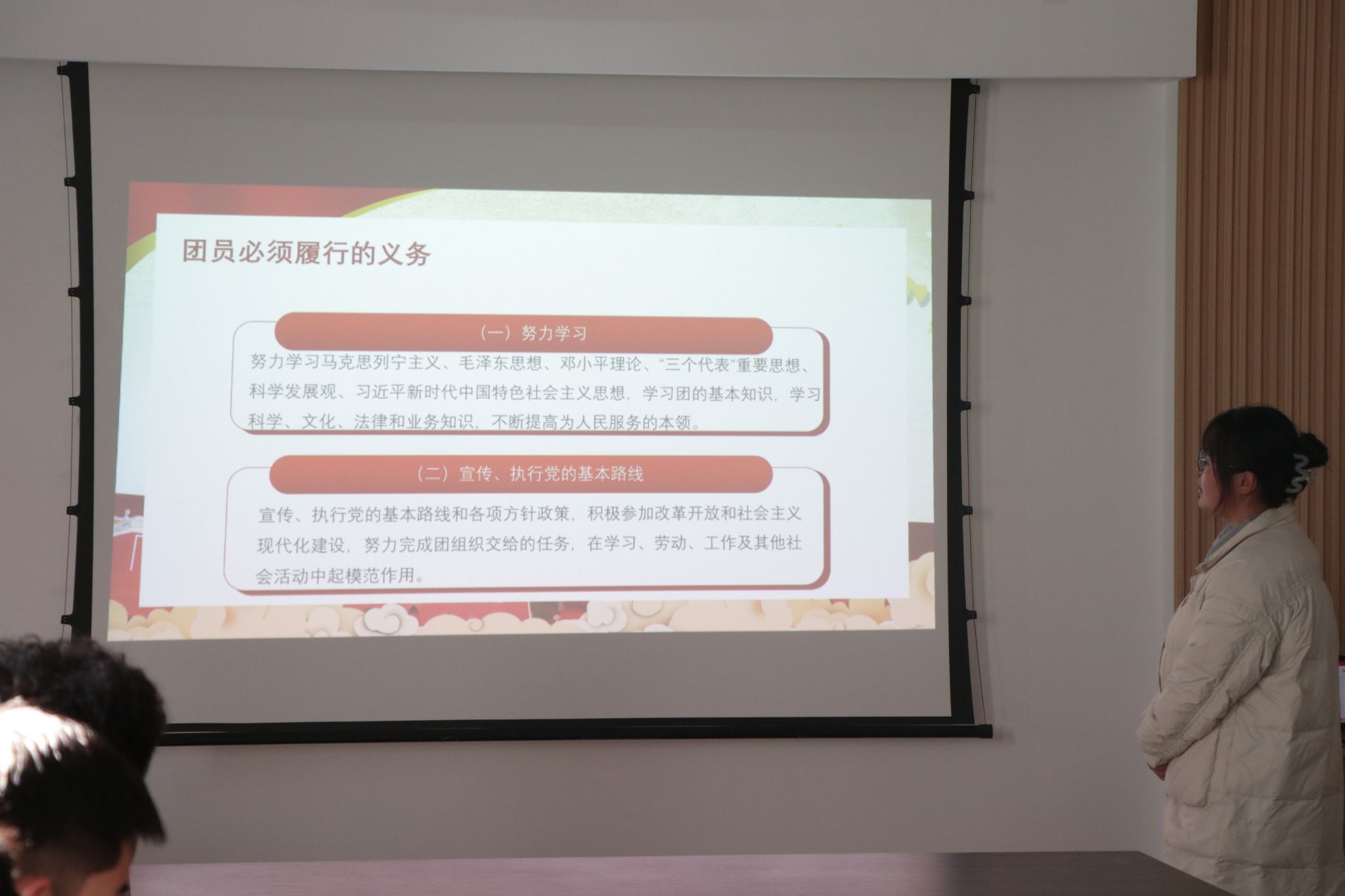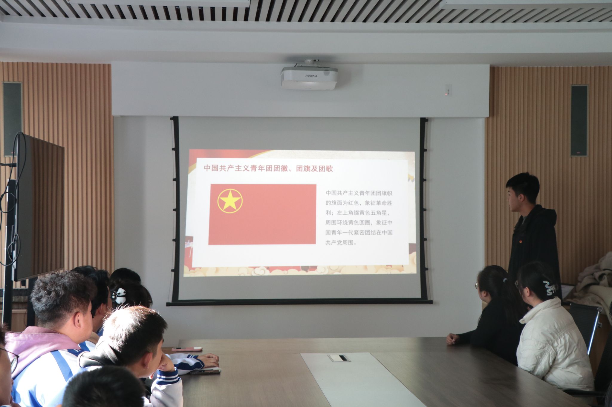 活动过程中,刘滢向全体团员、青年全面介绍了中国共产主义青年团的性质、指导思想等基本知识,王韦智详细讲解了团旗、团徽、团歌的由来和正确使用方法,高佳洋认真说明了团员必须履行的义务和享有的基本权利。随后,全体团员、青年共同观看了视频《共青团团史》,重温了入团誓词。慷慨激昂的入团誓词响彻整个会场。