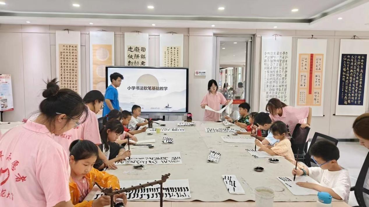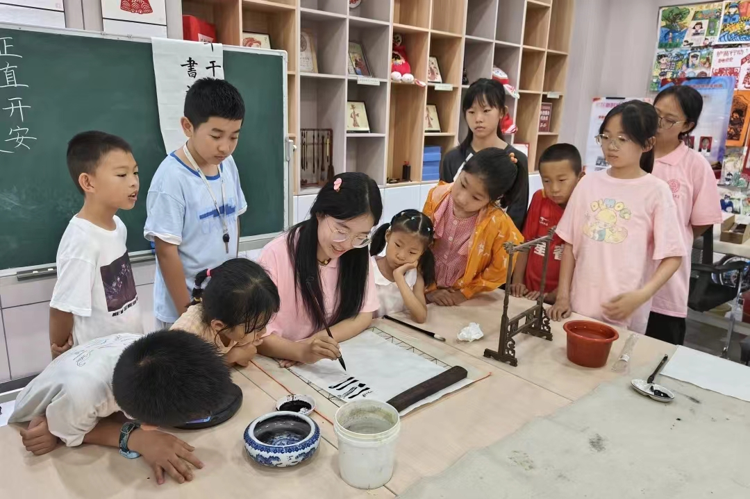 在线下课堂上,实践队队员们设计了一系列生动有趣的书法艺术教学活动,以浅显易懂的语言为孩子们讲解中国书法发展历史以及硬软笔基础技法,让孩子们在轻松愉悦的氛围中感受书法艺术的魅力,掌握书写技巧,为写好汉字打下良好的基础。上课之余,队员们开展了“我的成长故事”分享会,与孩子们分享个人成长故事,鼓励他们努力学习,勇敢追梦。结合孩子们的成长需要,队员们还组织了素质拓展和益智游戏,帮助他们增强身体素质,提高心理健康水平。线下教学结束后,队员们继续通过线上形式开展假期作业辅导,持续为孩子们提供学习指导,减轻他们的学习压力。