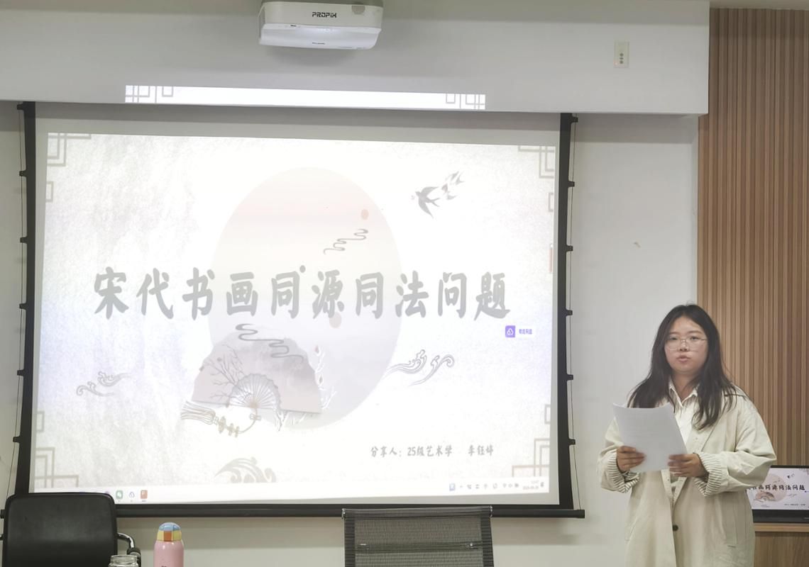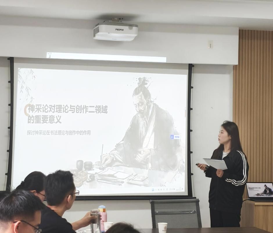 在员工分享环节,六位同学结合研读经典,多维度解读书法文化。张艳芳同学以《与书法相伴的生活》为引,分享从初识书法到领悟其为“生活方式与修行”的心路历程,还结合祝允明《晚间帖》、张大千书法菜单等案例,提出了“书法可融入日常交流”的独特见解;范雪娥同学围绕《战国书法研究》,系统梳理了简牍帛书的形制、构图与装饰特点,辅以实物图片,让在场师生直观感受了战国书法的多样性;张晟源同学依据《中国书画美学史》,从“骨、筋、肉、气”四维解析书法审美标准,并结合王羲之《兰亭序》《丧乱帖》等作品,梳理其历史演变脉络;田沐阳同学围绕《古代字体论稿》,以颜真卿与徐浩的书法实践为线索,探讨了唐代书法在法度严谨中体现的人格力量与时代精神;魏宇华同学深入剖析王僧虔“书之妙道,神采为上”美学思想,阐述其对当代书坛重形式轻内涵现象的反思与启示;李钰婷同学结合《中国美术史》,围绕“书画同源同法”议题,考察了宋代文人画与书法的互渗关系,揭示笔墨背后共通的审美理想。
