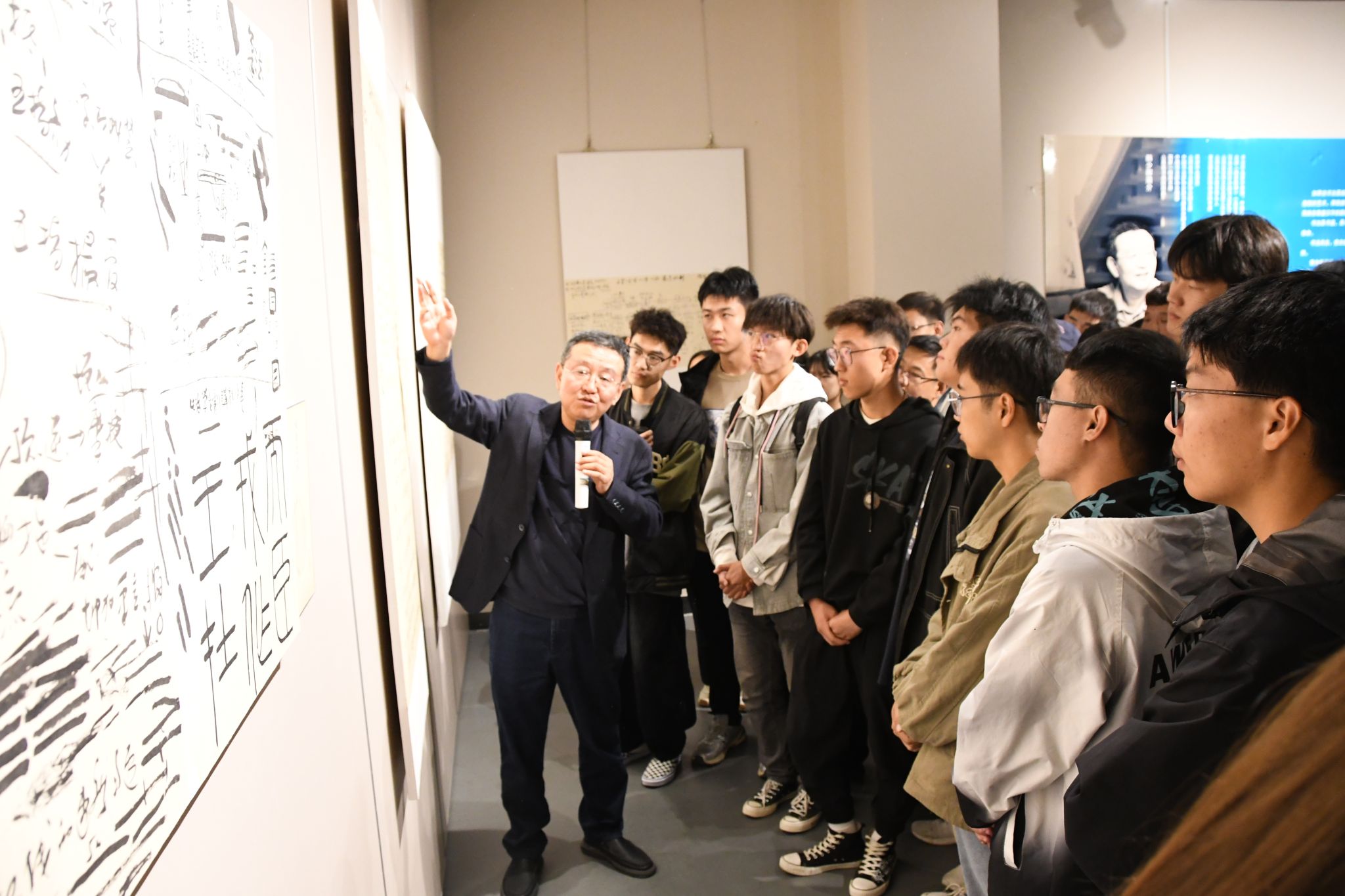 当天下午,韩少辉先生在乐天使副经理黄玉岩的陪同下来到展厅,为书法专业的研究生、本科生系统全面的分享了课徒稿中所表达的教学理念与教学方法。韩少辉先生结合自身长期书法创作实践,分别对书法中的笔法、字法、章法、墨法进行了宏观的分类解析,不仅为在场的员工更加直观地阐明了四者的类型、特点、技巧及其各元素之间的相互关联,而且对学书者在临摹和创作过程中存在的问题进行了深入的剖析。