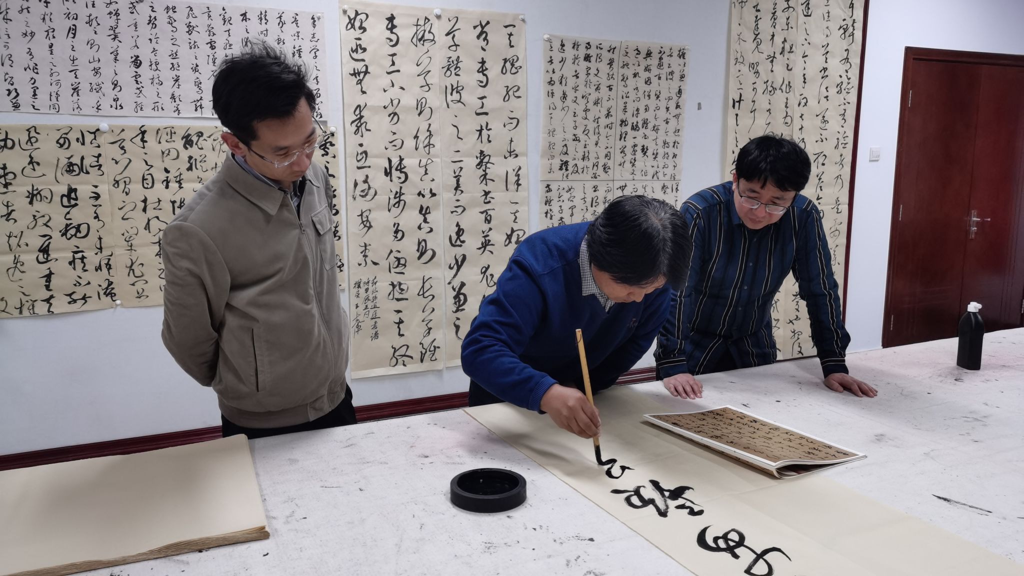 活动伊始,全体教师认真观摩了各位参研教师提交的作品。王建魁围绕本次临摹范本《十七帖》、《书谱》做了详细的技法讲解,并对此二帖在本科教学中的目的和意义做了阐释。曹亚彬、阴胜国等老师介绍了个人的临摹心得,并从不同角度表述了个人对于临摹范本的不同理解和自身所存在的问题、同时也对其他老师提交的作品讲述了自己的观点和意见。点评结束后,各位老师现场书写,相互观摩了不同的临摹方法和书写状态。