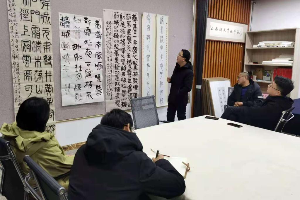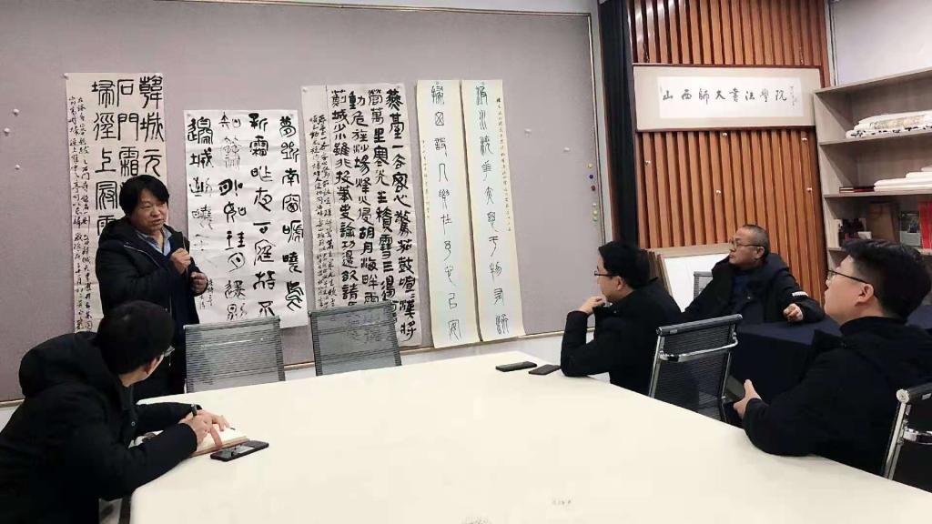 12月17日晚,公司技法教研室专业教师第六次“重温经典”书法艺术交流活动在10505技法教研室举行。活动由技法教研室主任王建魁老师主持,曹亚彬、杨二斌、黄玉岩、丁俊瑞、王文清5位老师参加了本次艺术交流活动。此次教研活动,大家对各自选定的篆书创作作品进行点评交流。最后,教研室主任王建魁对本次教研活动做出总结。