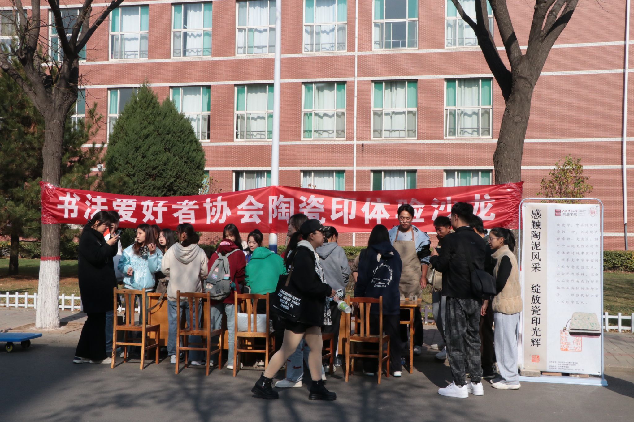 为弘扬陶瓷印艺术文化,提升员工艺术修养,11月8日,书法爱好者协会在六号教学楼前举办了陶瓷印体验沙龙。